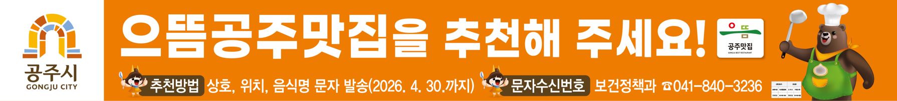 - (추천) 누구나 추천 가능(업소명, 업소 위치, 판매음식 문자 발송 ☎041-840-3236)